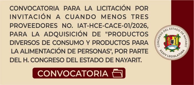 – Representaciones, Asociaciones y Grupos Parlamentarios – 0MORENA 0PVEM 0PT 0PAN 0PRI 0NAN 0LN Próximos eventos Próximos eventos Abr 14 Todo el día Sesión Pública Ordinaria virtual y/o presencial a las 11:00 horas. Ver calendario Avala Congreso de Nayarit reforma de austeridad y paridad de género Las y los diputados votaron a favor del Plan B Electoral Fortalece Congreso pensiones en Nayarit Reformas garantizan transparencia, equidad y estabilidad financiera Marcan mujeres agenda legislativa en Nayarit La Cámara de Diputados recibe propuestas del Parlamento de Mujeres de Nayarit 2026 Fortalece Congreso sector acuícola y apoya a productores locales Las reformas impulsan cooperación y desarrollo responsable en el sector acuícola Listo el Congreso para el Parlamento de Mujeres de Nayarit El próximo viernes a las 10:00 horas se desarrollará Sesiones En Vivo Redes Sociales Avisos PDI Leyes y Decretos Declaración Patrimonial Mesa Directiva de la 34 Legislatura. Periodo de recesoMesa Directiva Acuerdos Representación Jurídica Comisiones Legislativas Información Histórica Aviso de Privacidad Planes deTrabajo Sesiones del Congreso Buzón de Quejas Legislatura Iniciativas Gaceta Parlamentaria Legislación Estatal Trabajo en Comisiones SEVAC